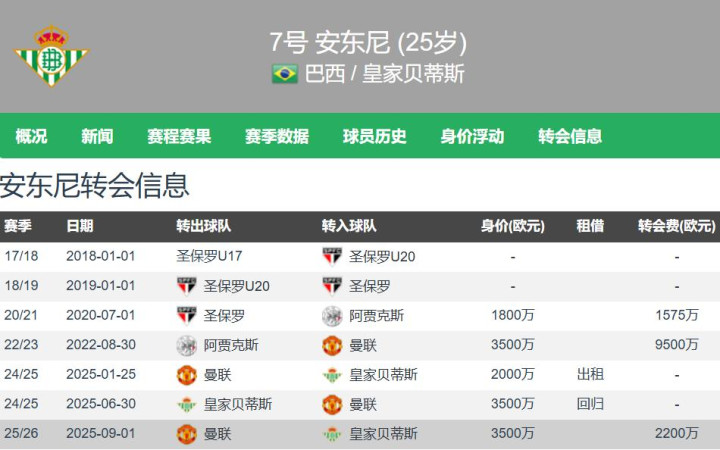 现年25岁的安东尼,身高1.72米,左脚右边锋,与皇家贝蒂斯的合同至2030年,德转估价3000万欧元,德转本周五将更新西甲球员的身价,安东尼有望上涨。